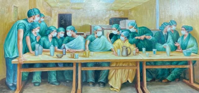 Tout d’abord, cette « Cène des Médecins », une huile du peintre chinois Cai Pingpei, installé à la Grande Chaumière depuis plus de 20 ans, la Cène des Médecins, sur un thème suggéré par la pandémie.