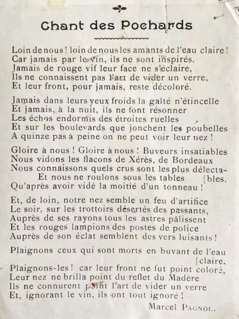 Le bon vin (Le bon vin Est divin, Multiplions nos rasades ; Aux refrains des chansons Camarades, Gaîment buvons !), sur l’air de « vaut bien mieux moins d’argent »