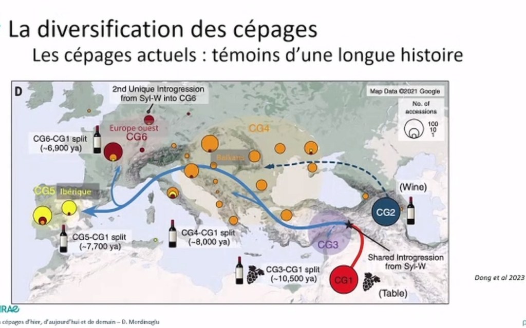 Un travail considérable réalisé récemment par une équipe chinoise et internationale sur plus de 3000 accessions (cépages cultivés et vitis sylvestris sauvages) a eu pour résultat de modifier notre vision de l’origine de la vigne. Les variétés de raisin de table du Proche Orient (et non du Caucase) seraient à l’origine, après croisement avec des variétés locales, des variétés cultivées et vinifiées dans la plupart des pays aujourd’hui.