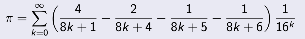 La formule BBP (Bailey-Borwein-Plouffe) permet de calculer le nième chiffre après la virgule de π en base 2 (ou 16) sans avoir à en calculer les précédents. Elle a été obtenue en 1995 par Simon Plouffe en collaboration avec David H. Bailey et Peter Borwein.