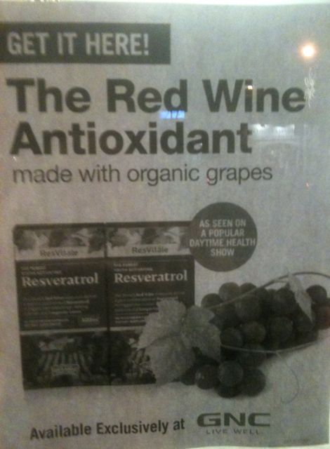 A la porte d’un drugstore, cette affiche vante l’effet antioxydant du vin rouge.