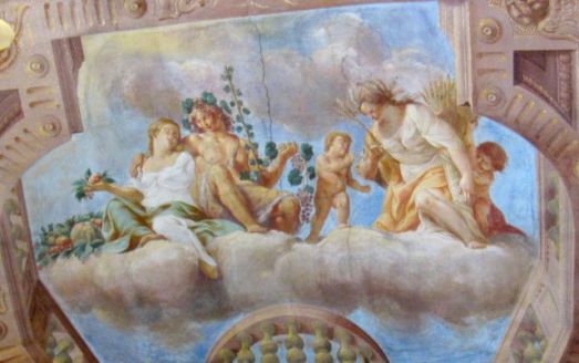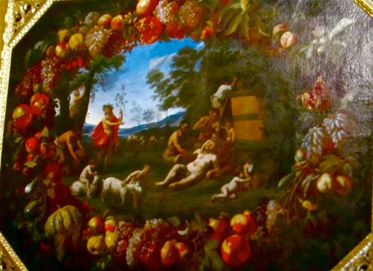 Voici des scènes de vendanges vues au plafond du château monumental qui domine la ville.