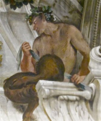 Ce petit bonhomme enfin, qui tient une flasque à la main, a été repéré au palais Valenti Gonzaga au sein d’une fresque dûe au peintre anversois Frans Geffels.Sur la route de Bologne se dresse Modène aux vinaigres réputés, on y voit cette grappe monumentale